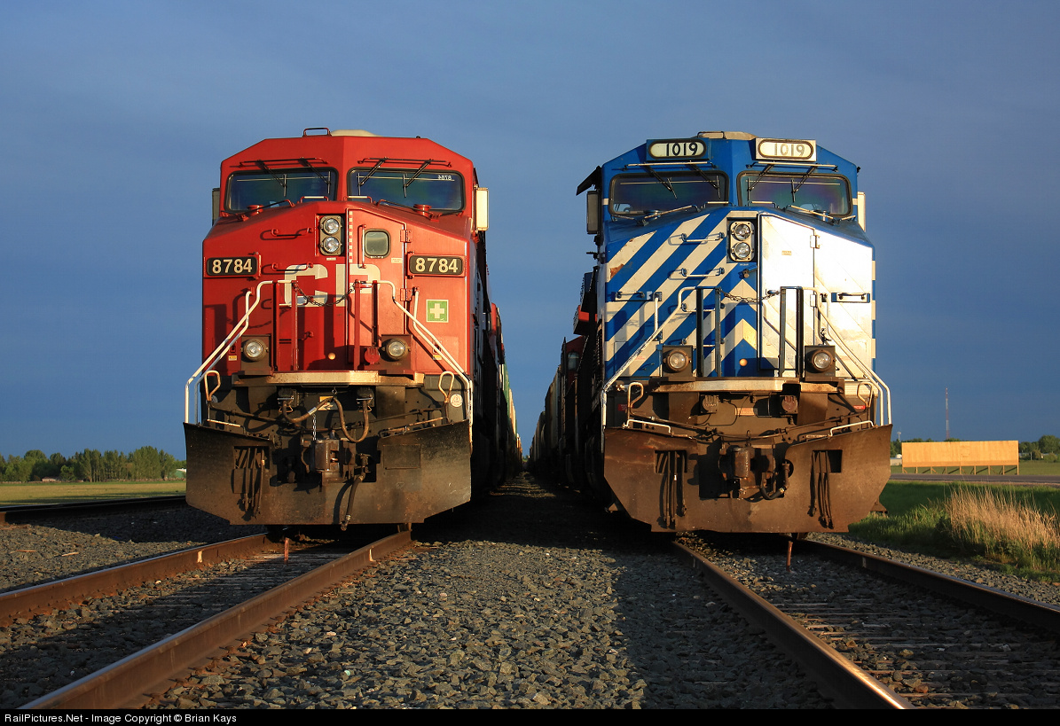 A well-timed gap in the dark cloud-cover provides some nice light on two grounded trains in Canadian Pacific's Thief River Falls yard. With the Canadian Pacific's employee strike north of the border, regular long-distance trains moving between nations reach their limit. CP 291 on the right and another manifest, CP 299 possibly, will remain in Thief River Falls until the CP strike settles and it can continue to Emerson, Manitoba.