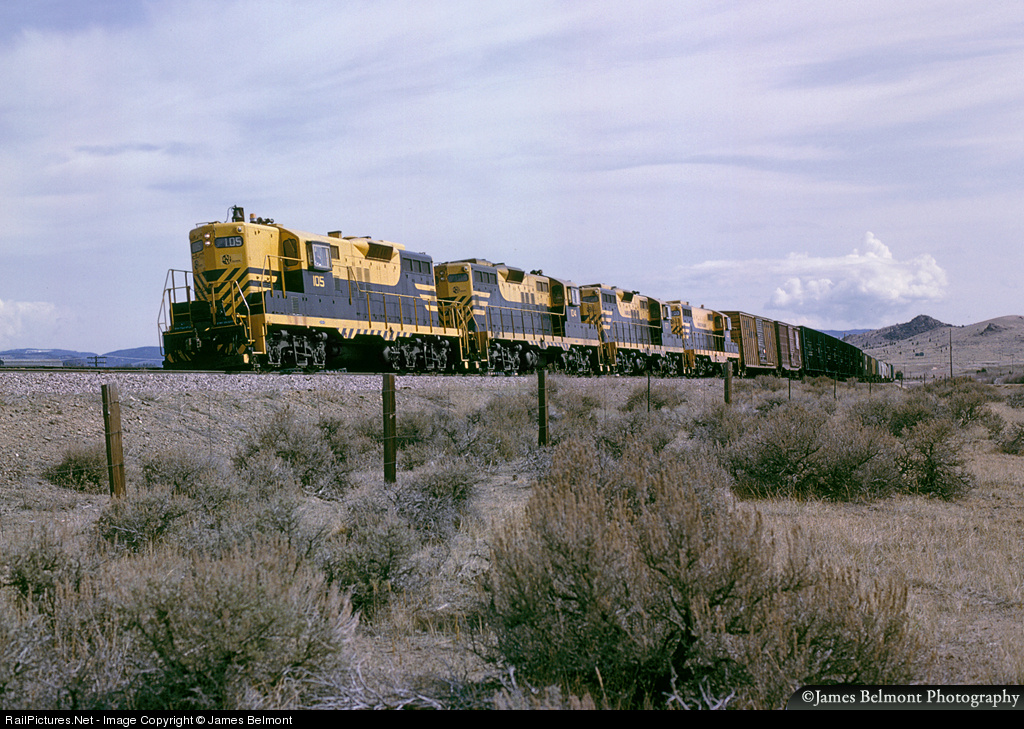 After making a sizable pickup at the Union Pacific interchange at Silver Bow, a matched quad of high hood EMD GP7/GP9 units head west through Ramsay, Montana for the Montana Rail Link interchange at Garrison. The 105, 104, 106 and 103 were built by EMD for the Butte Anaconda & Pacific Railway between 1953-1957. The Montana Western Railway leased 52 miles of Burlington Northern track (ex-Northern Pacific) between Butte and Garrison beginning in Sept. 1986. Train operations on this route returned to the owner, BNSF Railway in July 2003.