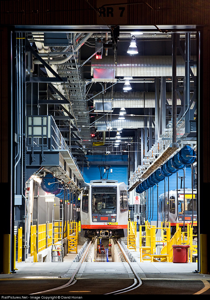 A Muni LRV rests for the night on track 7 inside the Metro East shops. Apparently taking photos through a fence from a public sidewalk is discouraged in this neighborhood; my friend and I were harassed by a group of passing security guards or fare collectors (we aren't quite sure what they were) who yelled at us about taking photos but, correctly, didn't actually do anything. We packed up and departed when the guard patrolling inside the fence walked over and stood directly in front of us, obstructing this view... too late, of course.