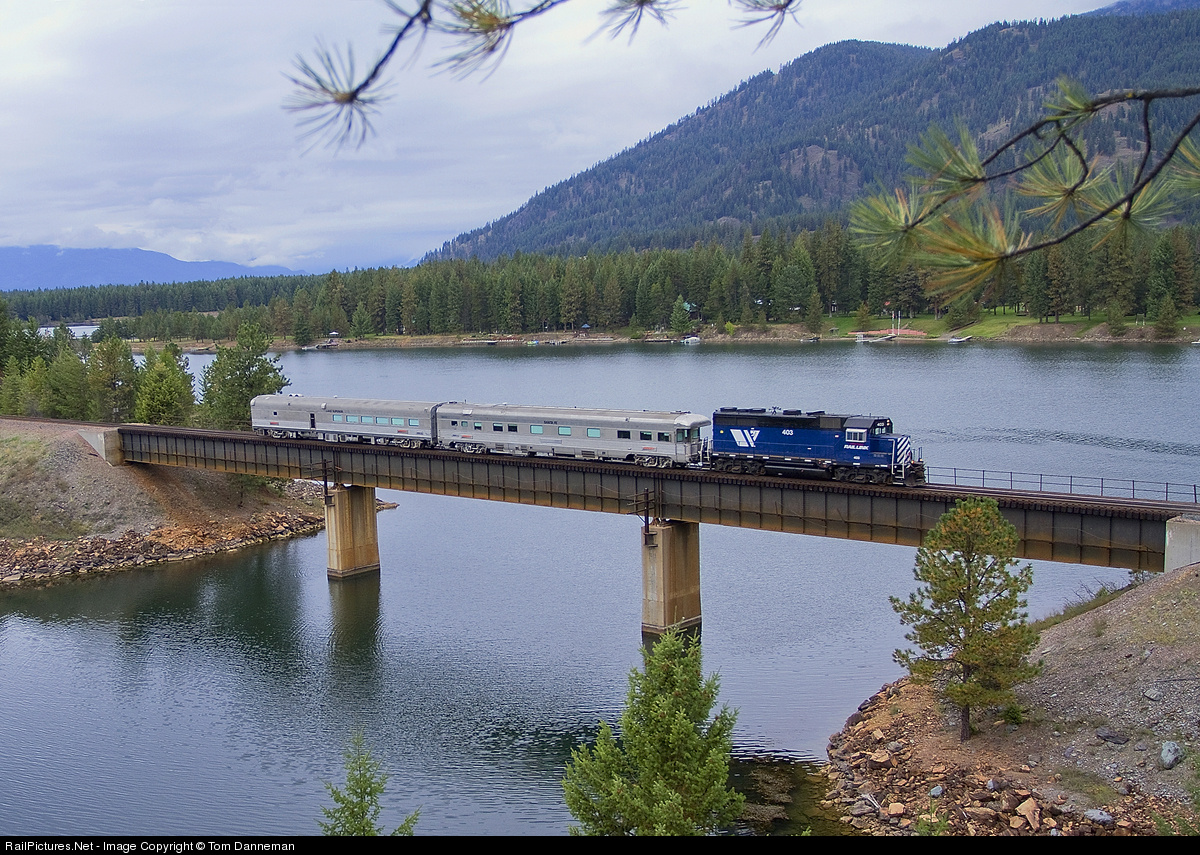 A Montana Rail Link business car special rolls across Bridge 50 west of Childs, Montana. The two BNSF business cars, diner "Lake Superior" and "Santa Fe," were headed to Missoula to supplement MRL's own business cars for a special which ran the following week. Former Rio Grande GP35 no. 403 leads the little speedster.