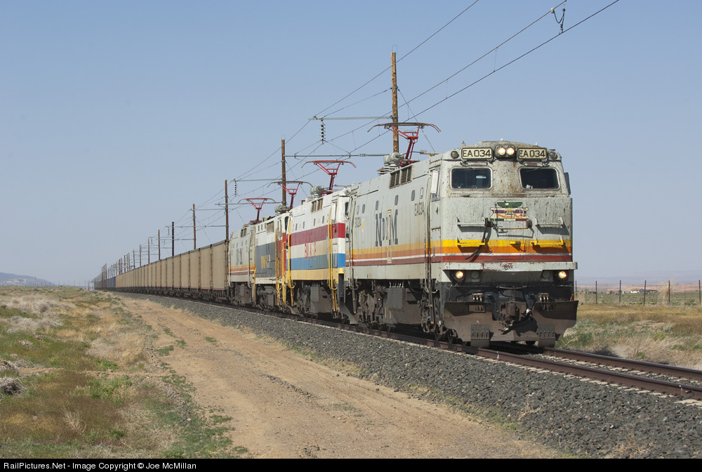e/b BM&LP empty hopper train approaches the loadout at Kayenta. When loaded, the train will head back to the power plant at Page, Arizona. Engine consist: NdeM EA034, BM&LP EA036, BM&LP 6006, NdeM EA039