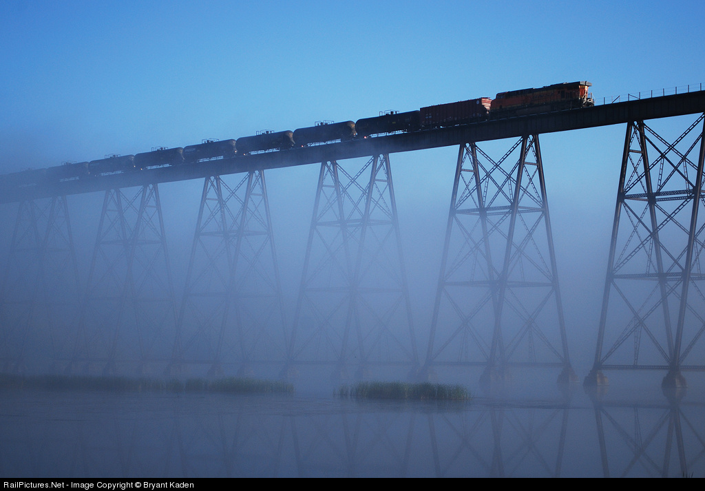 Fog hangs in the valley as a DPU pushes a tank train across BNSF's large bridge.