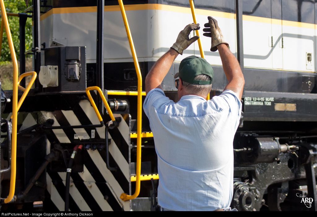 | "Little Bit More" With the advent of the radio, hand signals are slowly fading away. It is difficult to find a trainman that knows more than just the basic signs. This Conductor is signaling to the Engineer that he is inches away from coupling up. |