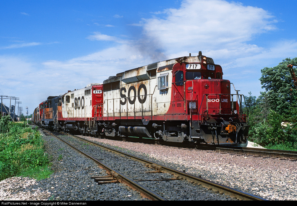 On June 28, 1987, a Soo Line freight from North Fond du Lac, Wisconsin, uses the connector track at Duplainville for a trip to Milwaukee. Leading the train is GP30 No. 717, and is trailed by three Soo Line GP9s and two former Milwaukee Road GP20s (rebuilt GP9s). The Alco trucks from traded in Soo Line FAs are obvious on No. 717.