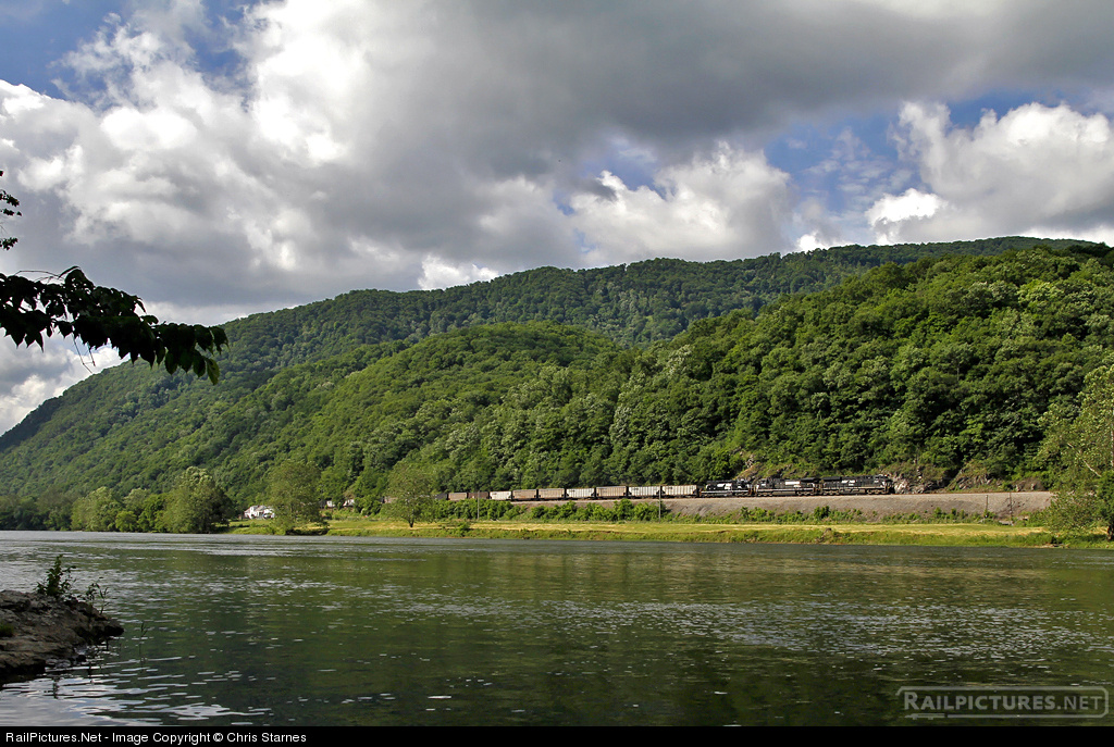 A westbound empty coal hopper train rolls along the scenic New River at Robinson on its way to the coalfields west of Bluefield.