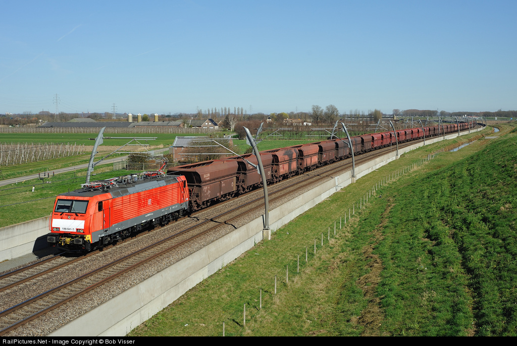 | DBS 189 041 with an empty iron-oretrain from Dillingen (D) to Rotterdam Maasvlakte. All 189 's will lose their Railionbranding and get a DB-'cookie'. On this locomotive, the Railionbranding is still visible. |