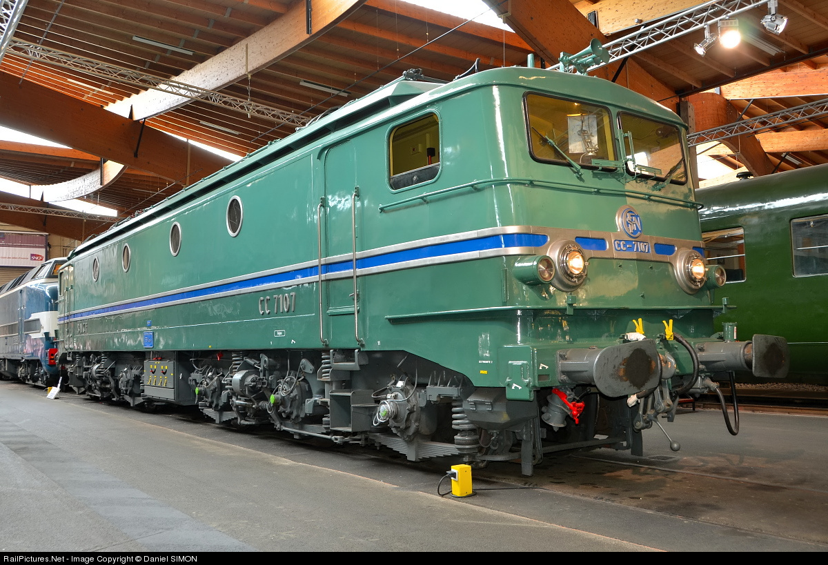 SNCF's CC 7100 class are part of a series of electric locomotives built by Alsthom. The prototype 'CC 7000' (7001 & 7002) were built in 1949 and the production series locomotives CC 7101-CC 7158 followed during 1952–1955. Two of the class are notable for setting world rail speed records: CC 7121 reaching 243 kilometres per hour (151 mph) on 21 February 1954, and CC 7107 reaching 331 kilometres per hour (206 mph) on 28/29 March 1955 between Bordeaux and Dax. The CC 7107 hauled a three car train with streamlining modifications to reduce aerodynamic drag.