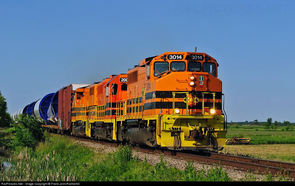 | Gorgeous late-afternoon weather, as Quebec & Gatineau windmill unit train makes good time across farmlands. In Montreal the consist will be interchanged with Canadian Pacific, then it will proceed west to Alberta. |
