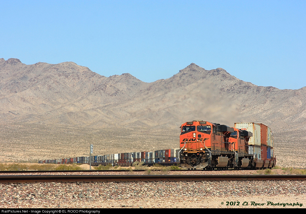 Mile Post 595 - A westbound stack train rounds the bend near Arrowhead Junction as it nears the grade grossing at Highway 93 in rural San Bernardino County. The mile marker numbers are numbered in track miles from El Paso Junction in New Mexico and end in Barstow California at M.P. 745.9.