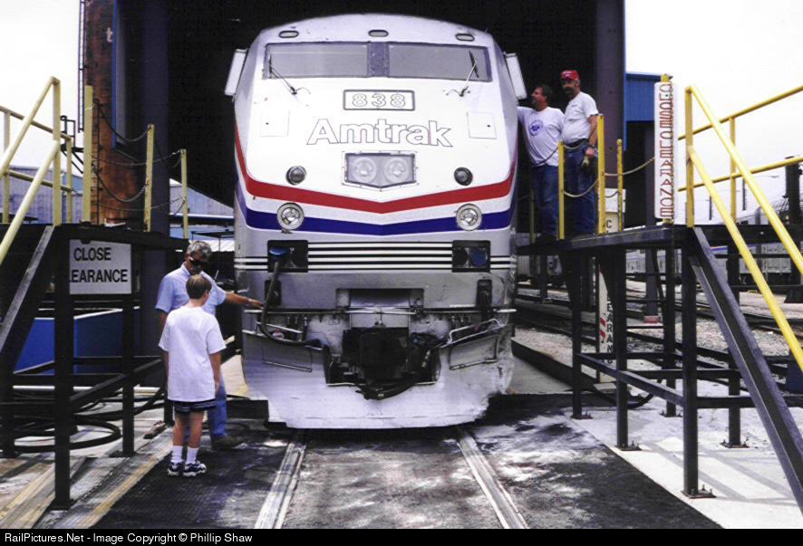 | A P40DC sits in Sanford shops while a boy takes a tour of the big locomotive(Notice to the right through the rafters,The dead head Sunset ltd. and the left side of the plow looks like it hit something.) |