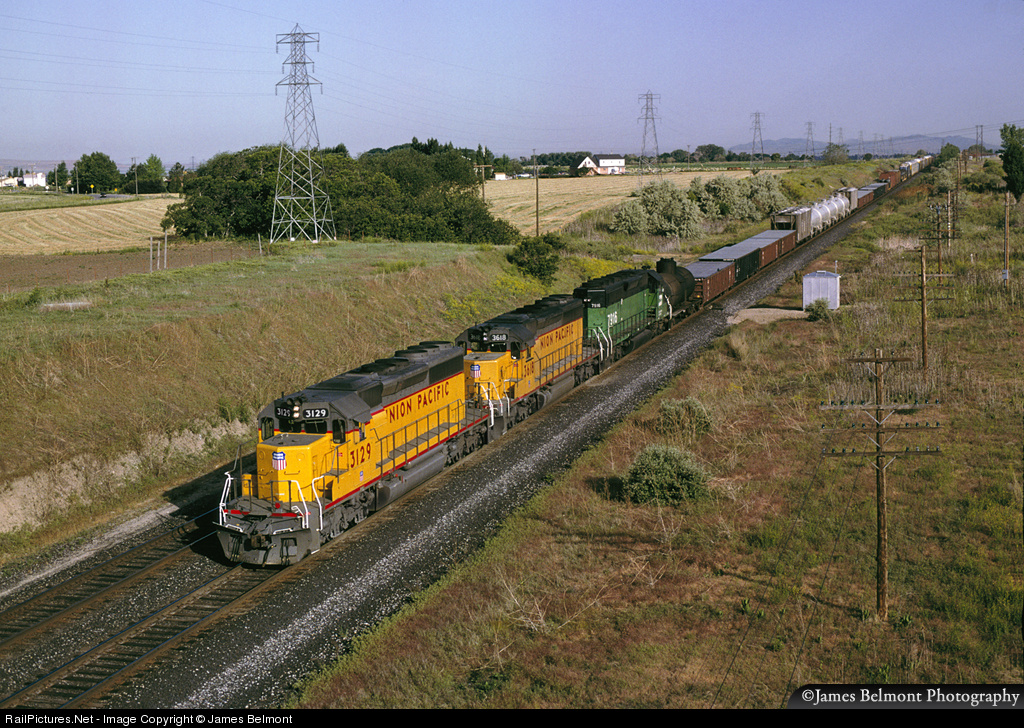 With a visitor from the Burlington Northern adding a little color, Union Pacific's NPST (North Platte, NE to Stockton, CA) freight rolls down Cherry Hill in Farmington, Utah. The landscape here has changed dramatically in the past 20 years with hundreds of new homes sprouting up where the alfalfa and corn once grew.