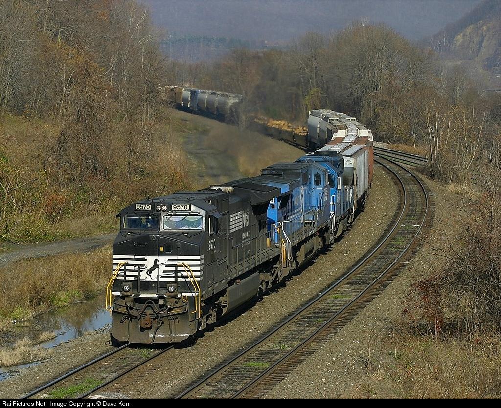 | NS 9570 approaches Enola Yard from the North. From the Overview Bridge. Canon 10D and 70-200mm lens, 1/350 second exposure, f8.0, F.L. 85mm, ISO 100. |