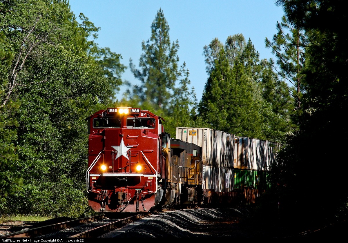 | Union Pacific 1988 charges up maintrack #1 of the Roseville Subdivision as it brings a long stack train through Applegate, California. The Katy will soon have to battle the fierce grades of Donner Pass. |