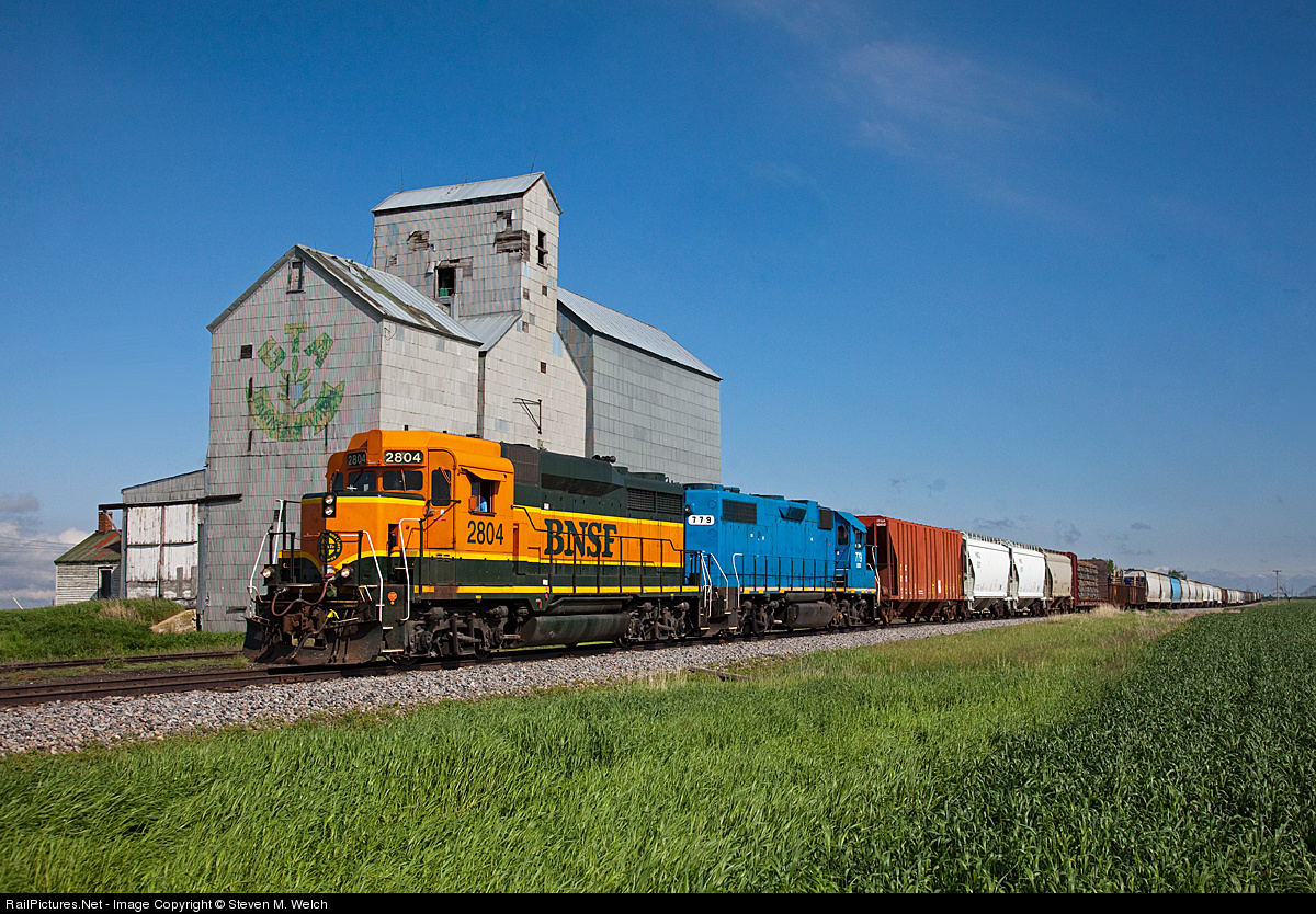 An EMD duo trots along the Crosby Subdivision, on old GN steam era 1912 stick rail, passing the "GTA Farmers" abandoned elevator in the small community of Hartland. After the train rocked and rolled by, we found burn marks in the rails from presumably a steam locomotive, and lots of cinders... Just showing that steam still lives, in an unique way.
