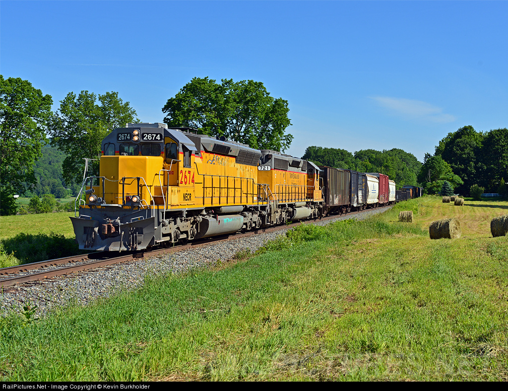 Reunited in New England! One of five recently acquired ex-Union Pacific SD40M-2s have already been activated and placed into service. On Saturday morning, June 16, the NECR (not yet receiving the logos/long hood lettering) SD40M-2 2674 leads ex-FEC, nee-UP and relettered to NECR SD40-2 721 at Cornish, NH.