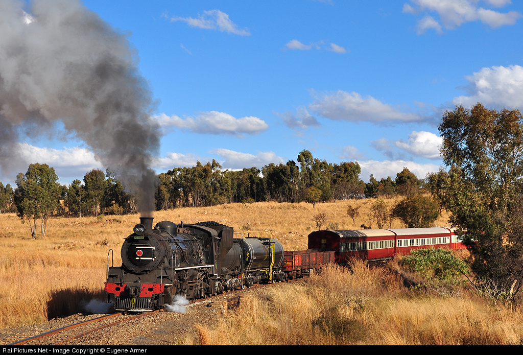 | Although the old Abattoir outside the town of Cullinan no longer exists, the local railfan community still refers to this location by that name. On its way to Cullinan with a Friends of the Rail photo charter, Class 24 # 3664 performs a photo runby at the Abattoir on a sunny winter afternoon. |