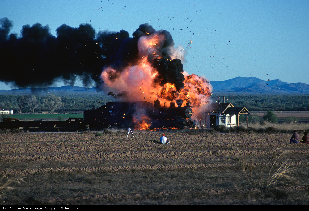 This was part of the making of the movie "Stay Tuned" using Fillmore & Western's 2-8-0 on the Copper Basin near Florence. This scene is at "Hellhole" as the Devil's Engine 666 hits a dynamite wagon with the heroine strapped to it.