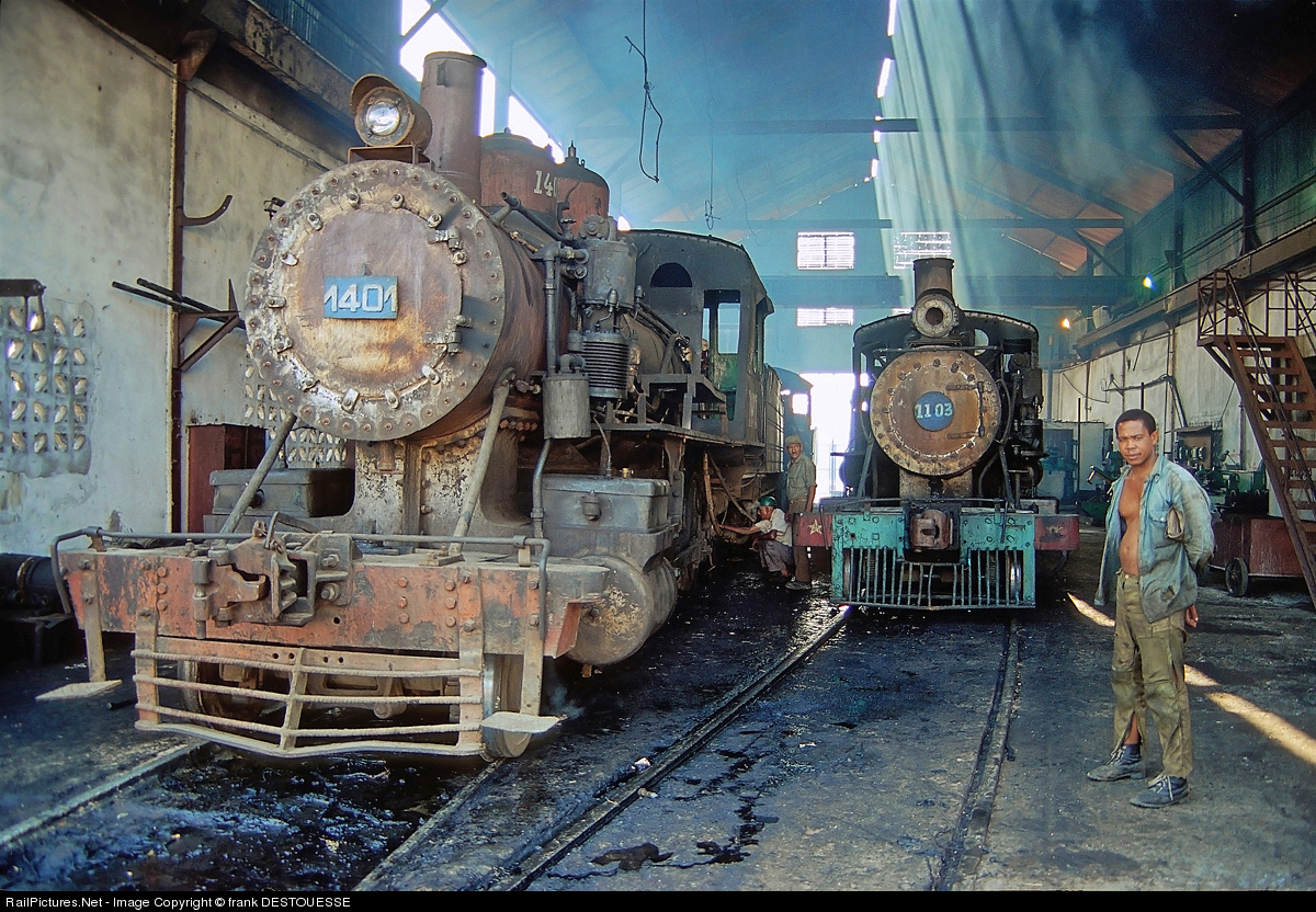 In the loco shed at PTB sugar mill. Minaz#1401 (Alco 2-6-0 from 1908) and Minaz#1103 (Baldwin 2-6-0 from 1920).