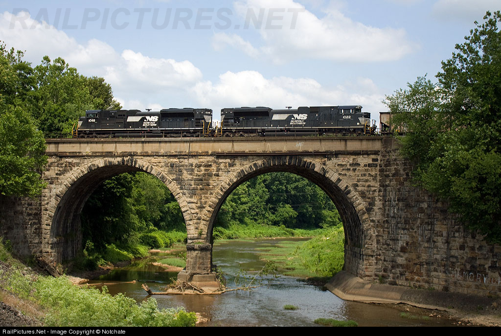 NS 1048 and NS 1022 cross over the stone arch viaduct in Latrobe, PA