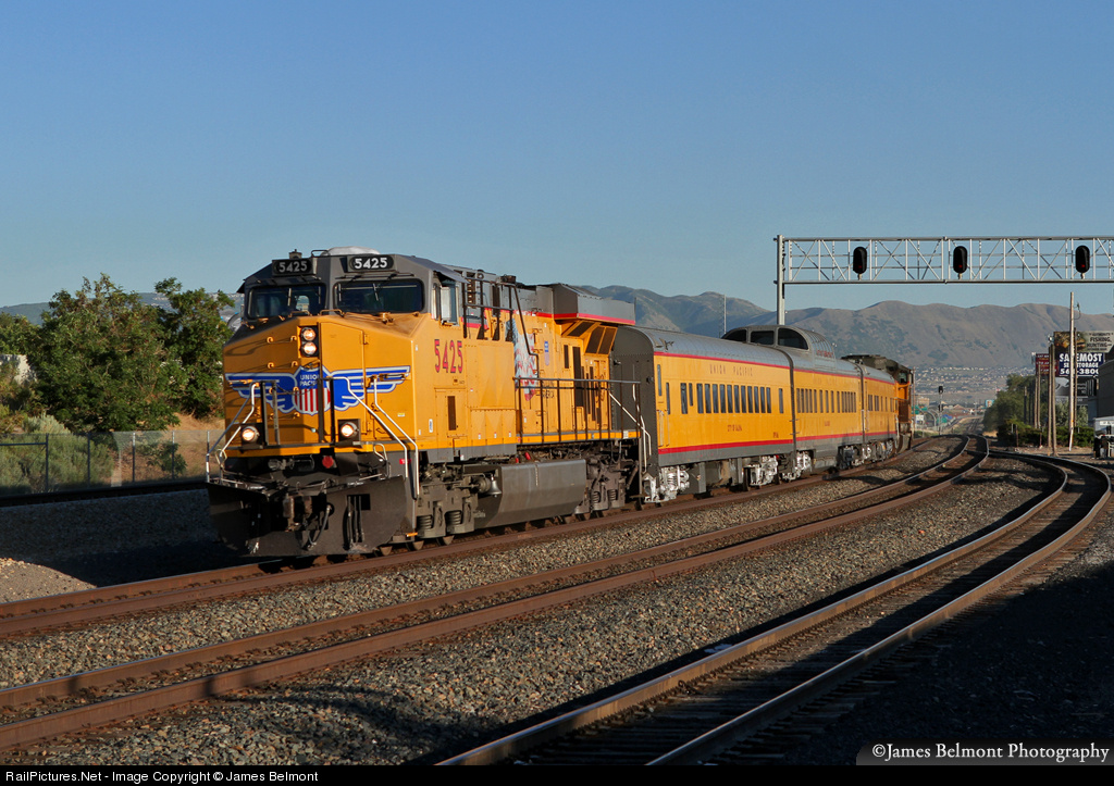 | On the evening of the Summer Solstice, a UP Operation Lifesaver Special takes a tour of the former D&RGW mainline at Midvale, Utah. |