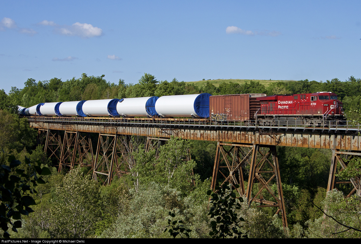 | A single GEVO does the honours on a rare movement of windmill sections across southern Ontario. The train was only doing about 5 MPH across the bridge, probably some restriction that goes along with moving these dimensionals. |