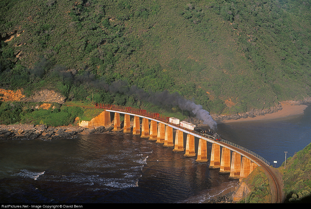 An unidentified Class 24 draws her goods train across the bridge, situated at the mouth of the Kaaimans River. Regular steam operations on the South African Railways had ended in 1991, but this line had been declared a museum line and steam traction was maintained. Sadly, the line was closed in 2006 following a large landslide at this location.