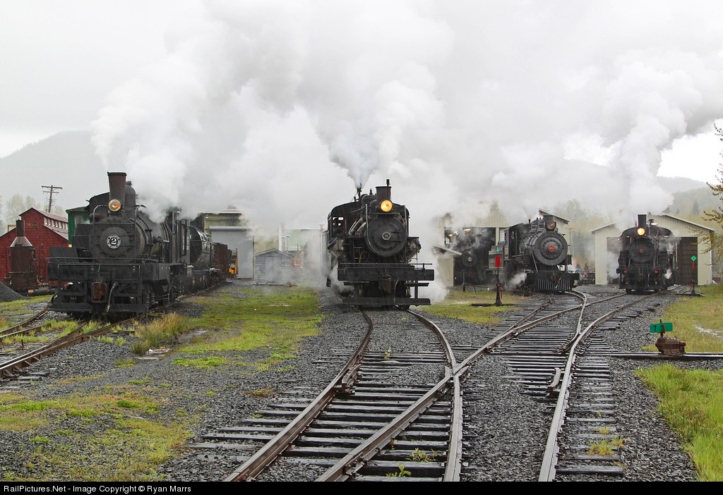 From left to right: Rayonier #2, Kinzua Pine Mill & Lumber #102, Polson #70, and Hillcrest #10 partake in a simultaneous whistle blow on the Mt. Rainier Scenic Railroad.