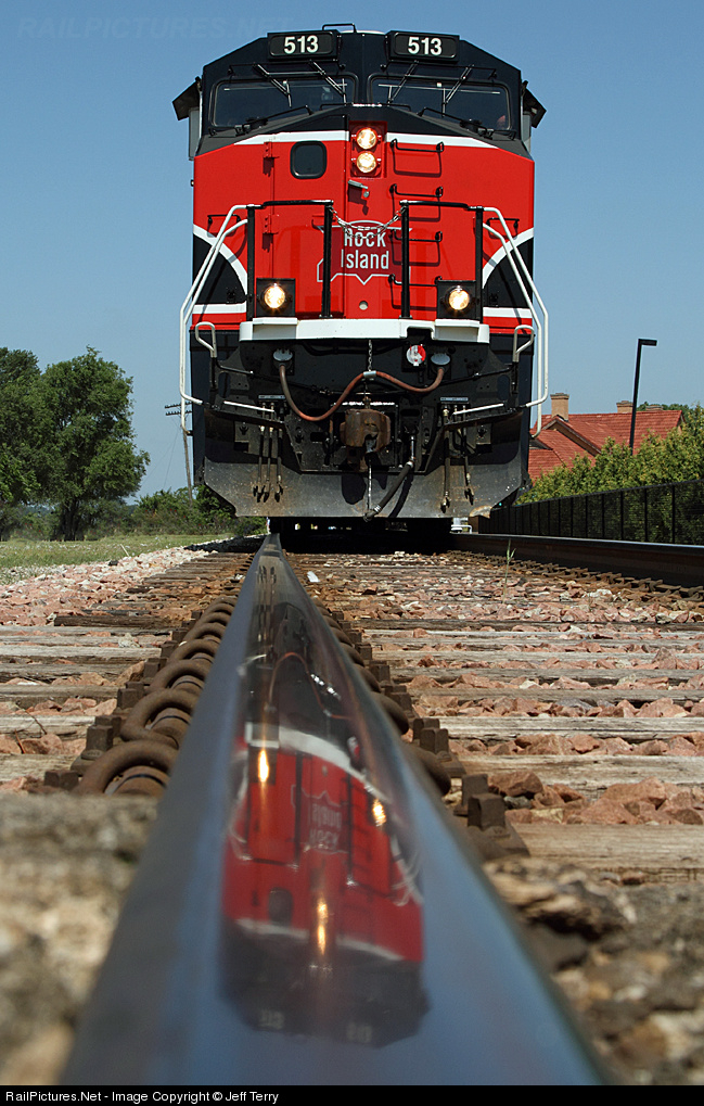Rock Island 513 reflected on the rail during the photo stop at West Liberty, Iowa. This is the former Rock Island main line, now operated by Iowa Interstate.