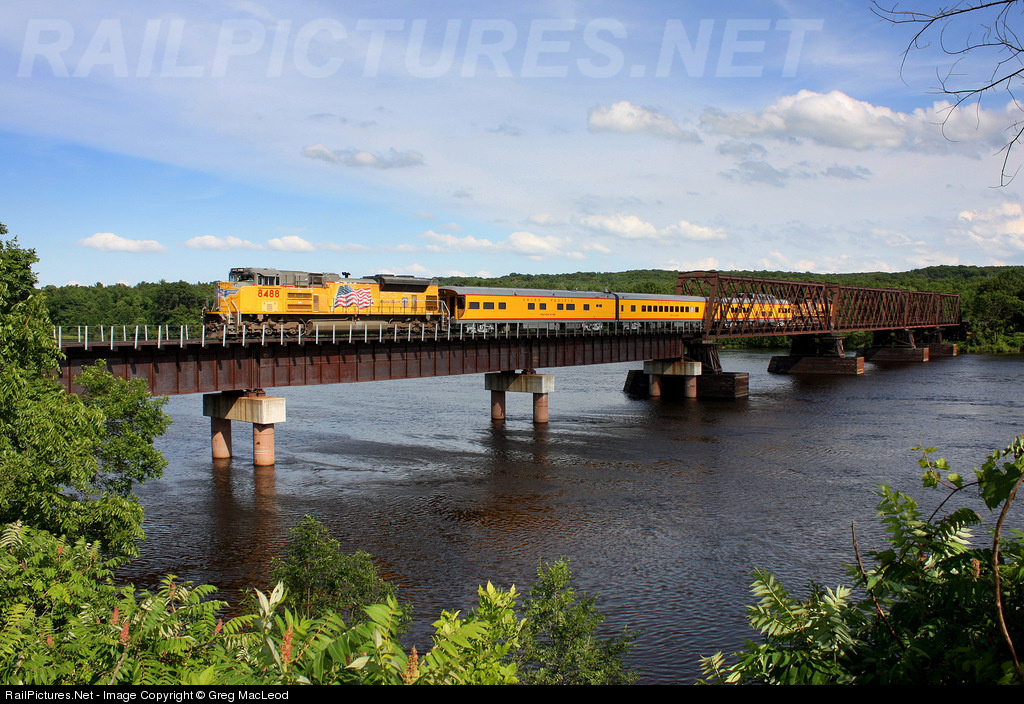 | A UP employee appreciation special crosses bridge in Chippewa Falls. Half of the bridge was destroyed in fire which is why there are two types of bridge spans seen here. This train originated in Altoona and ran to just north of this bridge before returning. |