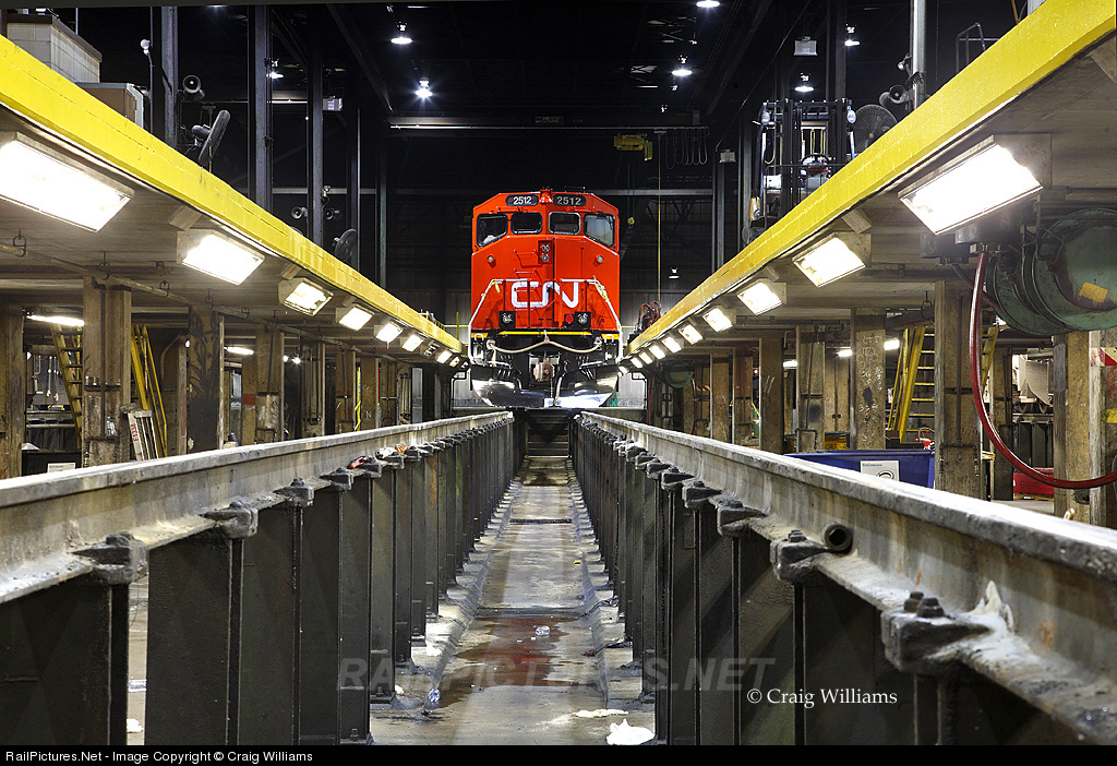 | Woodcrest shops service tracks have a few units this warm evening. The 2512 is getting some work done to it after some touch paint was done on the nose. Woodcrest doesn't do the heavy painting like Centralia does, but they do some touch up stuff. Photo: taken on CN property by CN employee with permission. |