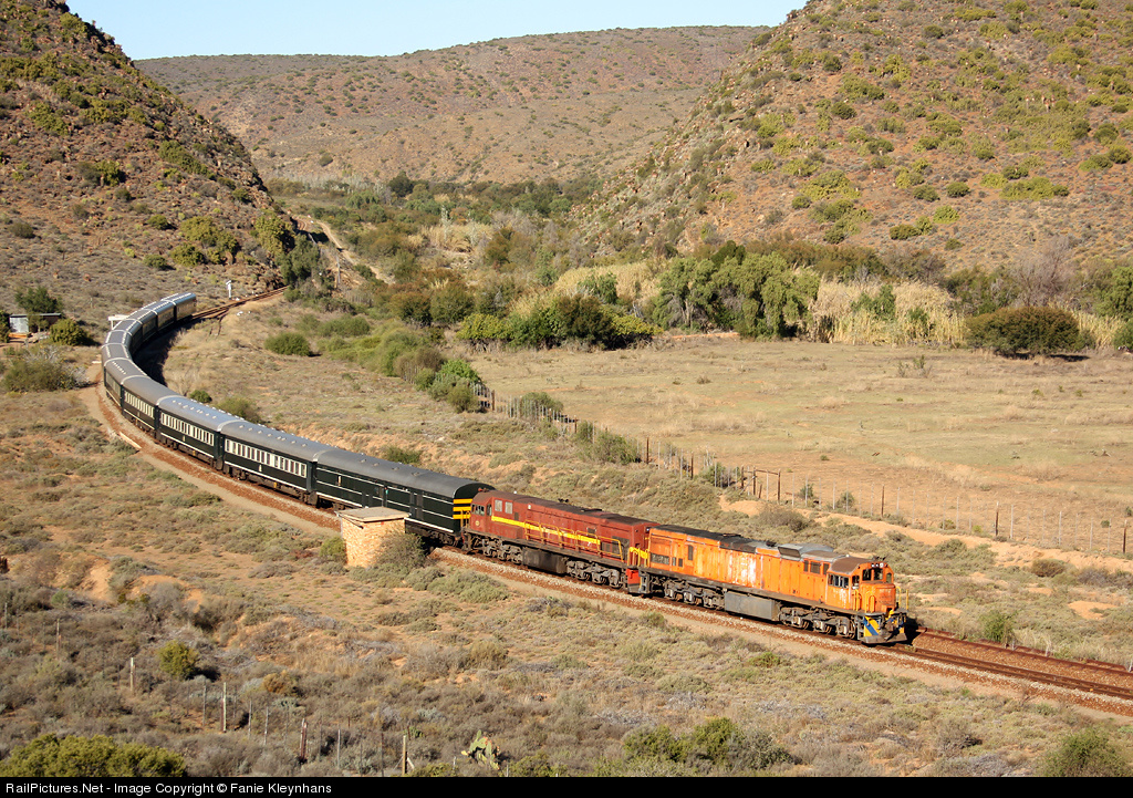 Rovos Rail behind 2 class 34's rolling through Kandelaars siding (Chandelier in english) which name is from the red flowers of aloe plants in the area.