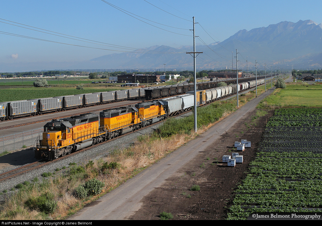 With a well matched trio of trusty SD40-2s for power, Union Pacific's LUL57 local departs Springville on the Sharp Subdivision. On this particular day, the 57's work included stops at Spanish Fork (Longview Fiber), Martmar (Ashgrove Cement), Lynndyl, and Intermountain Power. Note the drip irrigation farm and a collection of bee hives along the right of way. The expanse of the Intermountain Power Railcar Service Center marks the near background. This image was captured from the deck of the new 4th South overpass, easily accessible just off I-15.