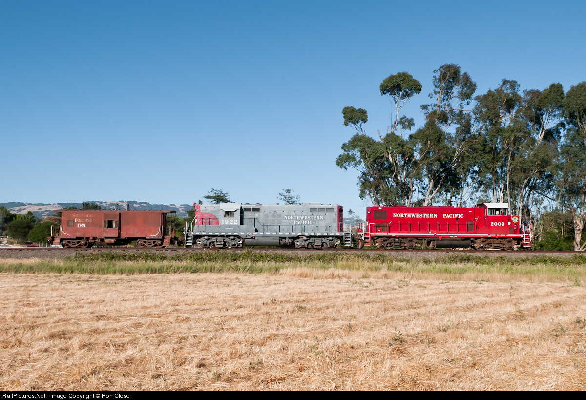 Southbound NWP #2009 and #1922 with caboose (ex-SP #1971) return to Petaluma after delivering concrete ties to Rohnert Park for the SMART (Sonoma-Marin Area Rail Transit) rail re-construction project. Earlier in the day, this trio brought the first ribbon rail train for the SMART project into Petaluma for an overnight stay. The next day, the rail train was shoved to Santa Rosa with the caboose being used as a shoving platform.