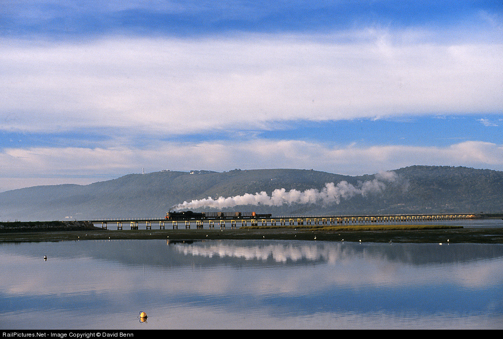 No 2640 trundles over the long causeway on Knysna Lagoon on a beautiful morning in the early autumn.