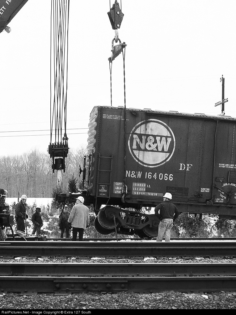 RF&P Mechanical Dept. employees gather around an N&W boxcar on March 6, 1978, as it is set back on the rails following a small "defrucalty" in the yard at Fredericksburg, VA.