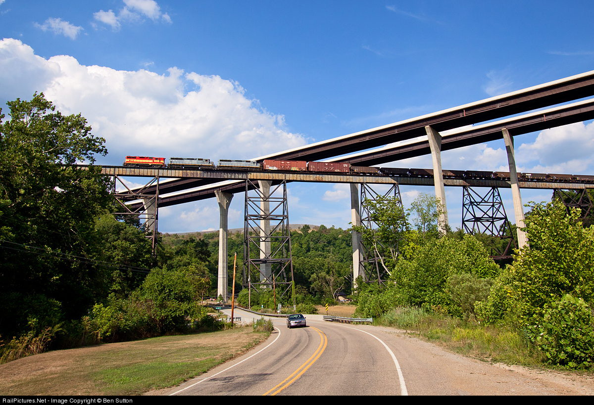 Way high up, but not as high as route 43, 355 takes 2 boxcars, a couple dozen or so loaded coal hoppers and 5 tank cars across the Mingo Viaduct.