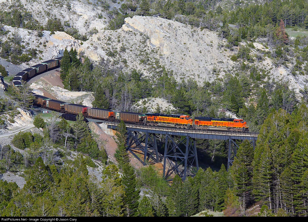 BNSF 9376 SD70ACE and BNSF 6161 AC45 GEVO were both fairly new as they rounded the 10 degree curve over Austin Creek. The grade over the bridge is about 1.8%, this is equivalent 2.2% when compensated for the tight curve. The train of coal is headed for ocean going ships at Roberts Bank, BC.