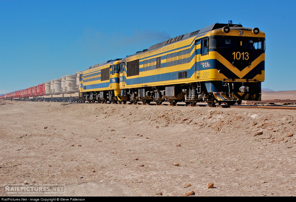 Two Mitsubishi-built diesels -- 1013 and 1021-- of the Empresa Ferroviaria Andena S.A., FCA, have a heavy ore train under control at Avaroa, Bolivia en route to Chile for export, two containers per flat car, each riding right over the car trucks. The unique locos have three trucks, and the center truck slides left or right to negotiate curves or switches. We're at an elevation of 12,214-ft. in the extraordinarily dry Atacoma desert on Aug. 14, 2008.