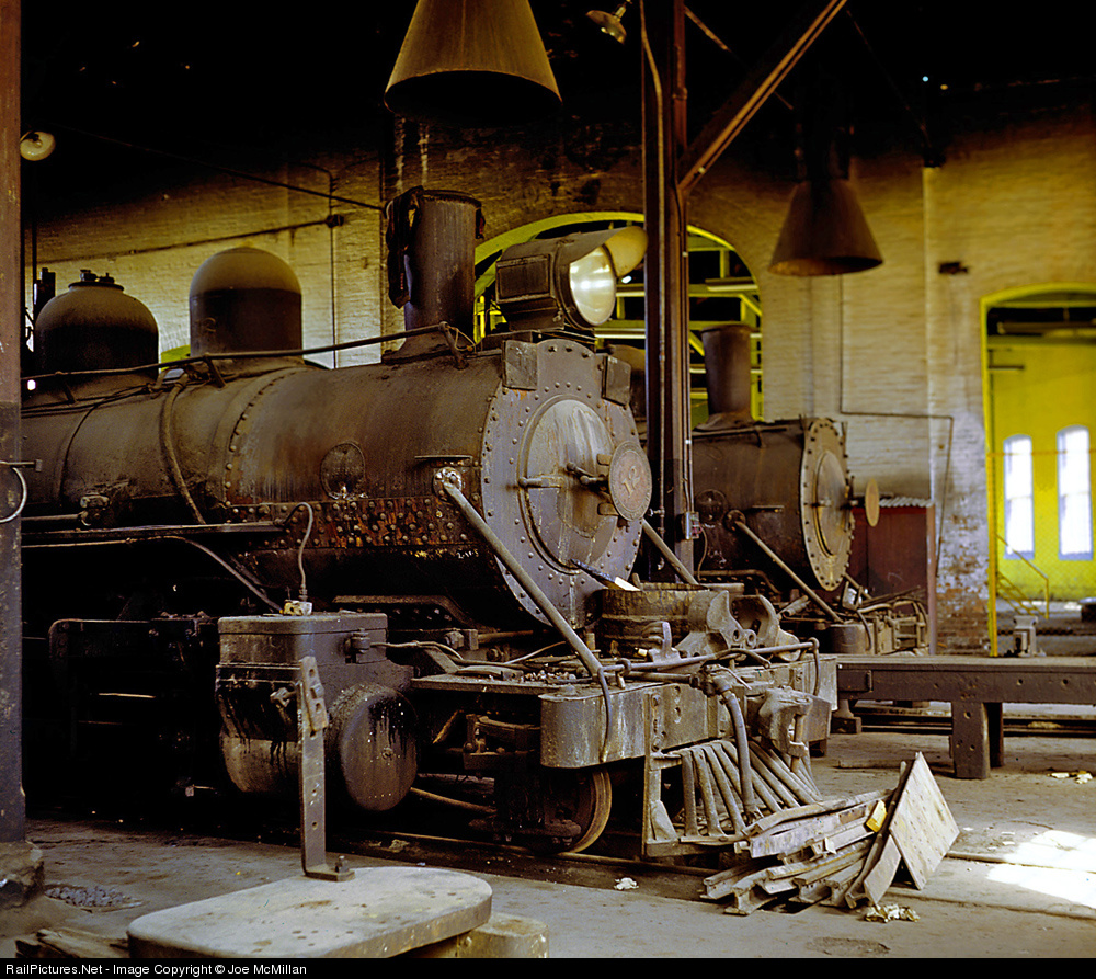 The Coahuila y Zacatecas was a Mexican narrow gauge (3-foot) short line that served a large copper mine and smelter at Concepcion del Oro, Zacatecas. The CyZ had just recently switched from steam to diesel power when this photo was made, so activity was at a minimum in the Saltillo roundhouse. Awaiting their fate, left to right, were 2-8-0 #12 and 4-6-0 #7.