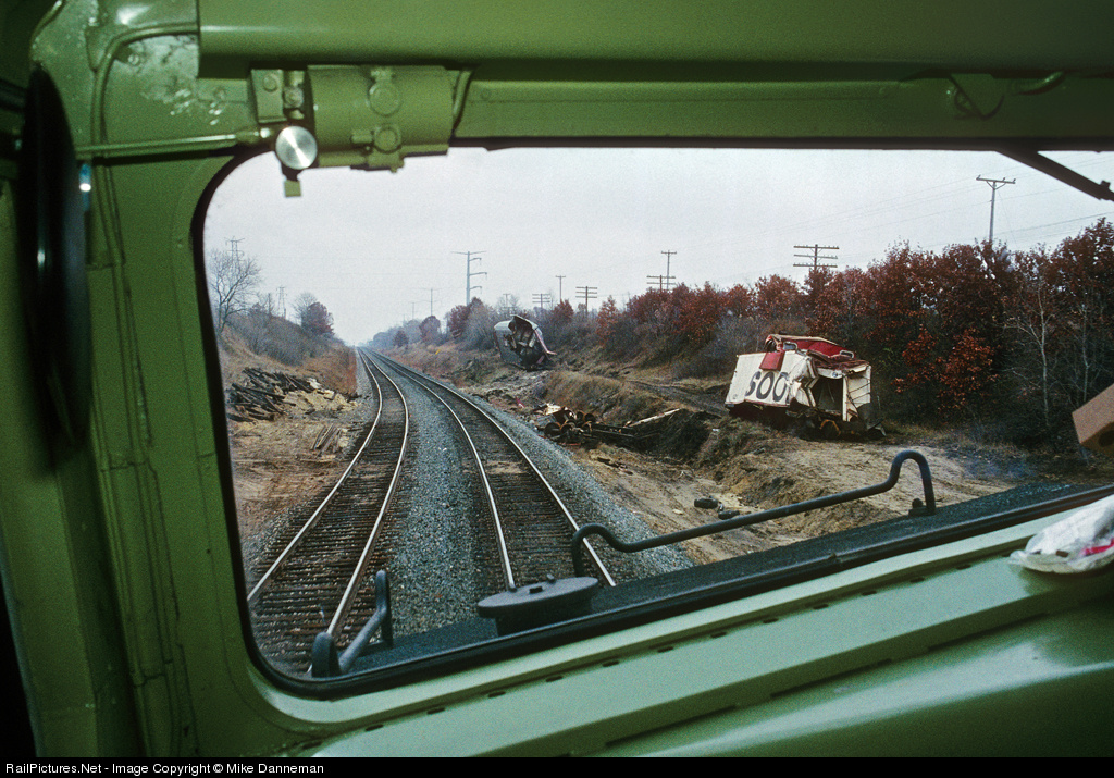 Aboard Amtrak No. 8 from the cab of F40PH No. 357 on November 9, 1992 just east of Rio and about 14.5 miles east of Portage, Wisconsin, we pass the scene of a derailment. I don’t remember the details, but the scattered freight car parts and crushed autorack and caboose illustrate the dangers of railroading. Obviously, Soo Line caboose No. 121 met its demise here.