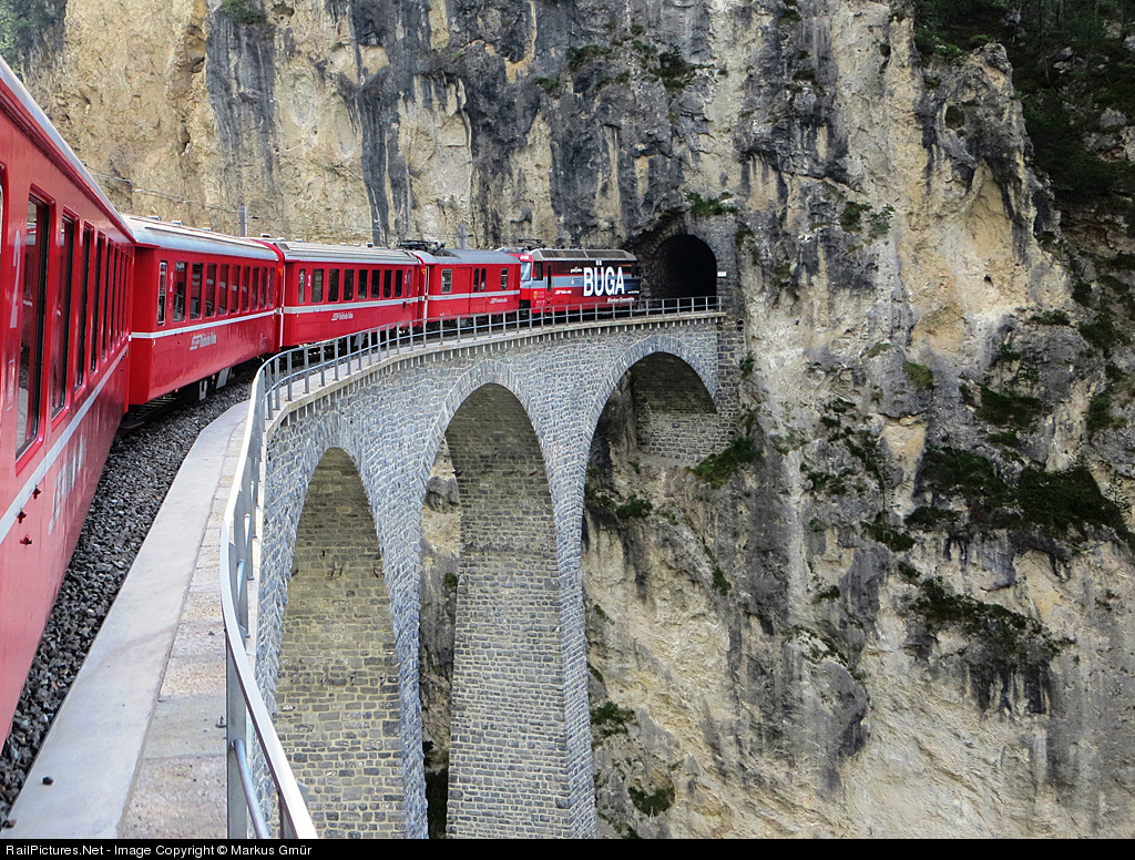 | Regional Express from Chur to St. Moritz between Tiefencastel and Filisur on the world famous Landwasser-Viadukt (136m long, 65m high) |