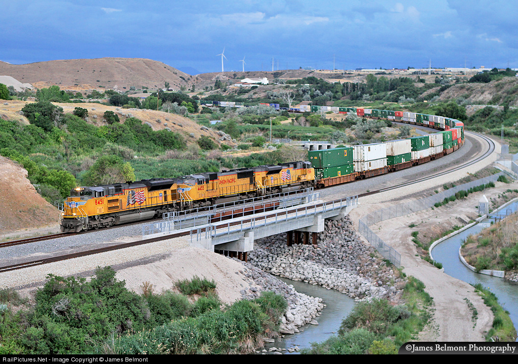 Due to heavy opposing traffic and a Form B work window on the Lynndyl Sub, Union Pacific's ZLAAHB-13 detoured via the Sharp and Provo Subdivisions on July 14, 2012. The Z train is pictured on former Rio Grande rails in the Jordan Narrows some 20 miles south of Salt Lake City. The ZLAAHD-13 began its journey at the Port of Los Angeles, CA and will interchange with the Norfolk Southern at Ashland Avenue Yard in Chicago, IL.