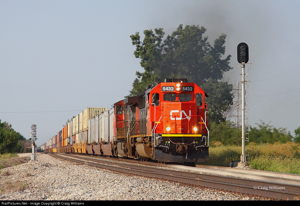 | CN hotshot Q-train is running late this morning due to power problems. The rear GE is dead, leaving only this old SD60 power this 9500 foot train bound for Markham Yard, in Chicago. The train is seen here passing the north end of Paxton. |