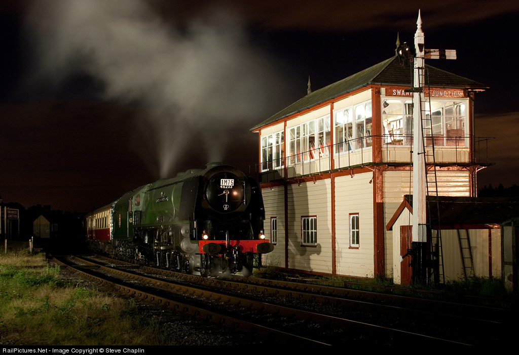 46233 Duchess of Sutherland waits by the signal box at Swanwick Junction. I think this locomotive looks stunning in its Brunswick Green livery. This shot was taken on a night shoot organised by the East Midlands Railway Photographic Society.