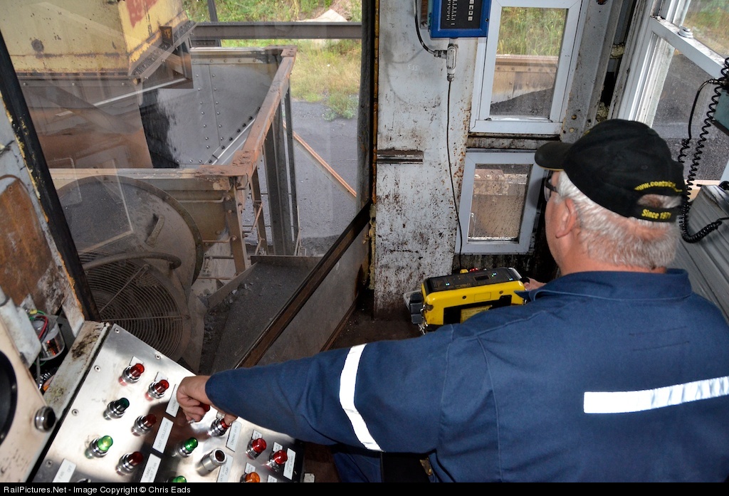 Kirby, PA 7/11/12 - The Cumberland Mine Railroad is a one-man operation. On each shift, one locomotive engineer serves as brakeman, conductor, engineer, coal loader, and unloader. Controlling his train by remote control pack (small yellow box), engineer Denny Barrish carefully flood-loads 38 hoppers (silver control panel) with coal destined for overseas ports and southern power plants. It takes about 45 minutes to an hour to load the cars. After loading, he will run the train 18 miles to the east to unloaded them at Alicia Harbor, where the coal will be transloaded to a barge to travel down the Monogahela and eventually the Mississippi River. Barrish has worked for the mine for 37 years--34 of them underground as a miner. His job running the railroad these last 3 years is "the best job of [his] life." With a broad smile and a jovial laugh he repeated says, "I love this job!" His enthusiasm for it showed clearly, and his professional care for his tasks was unmistakable. Access to the railroad property was by permission.