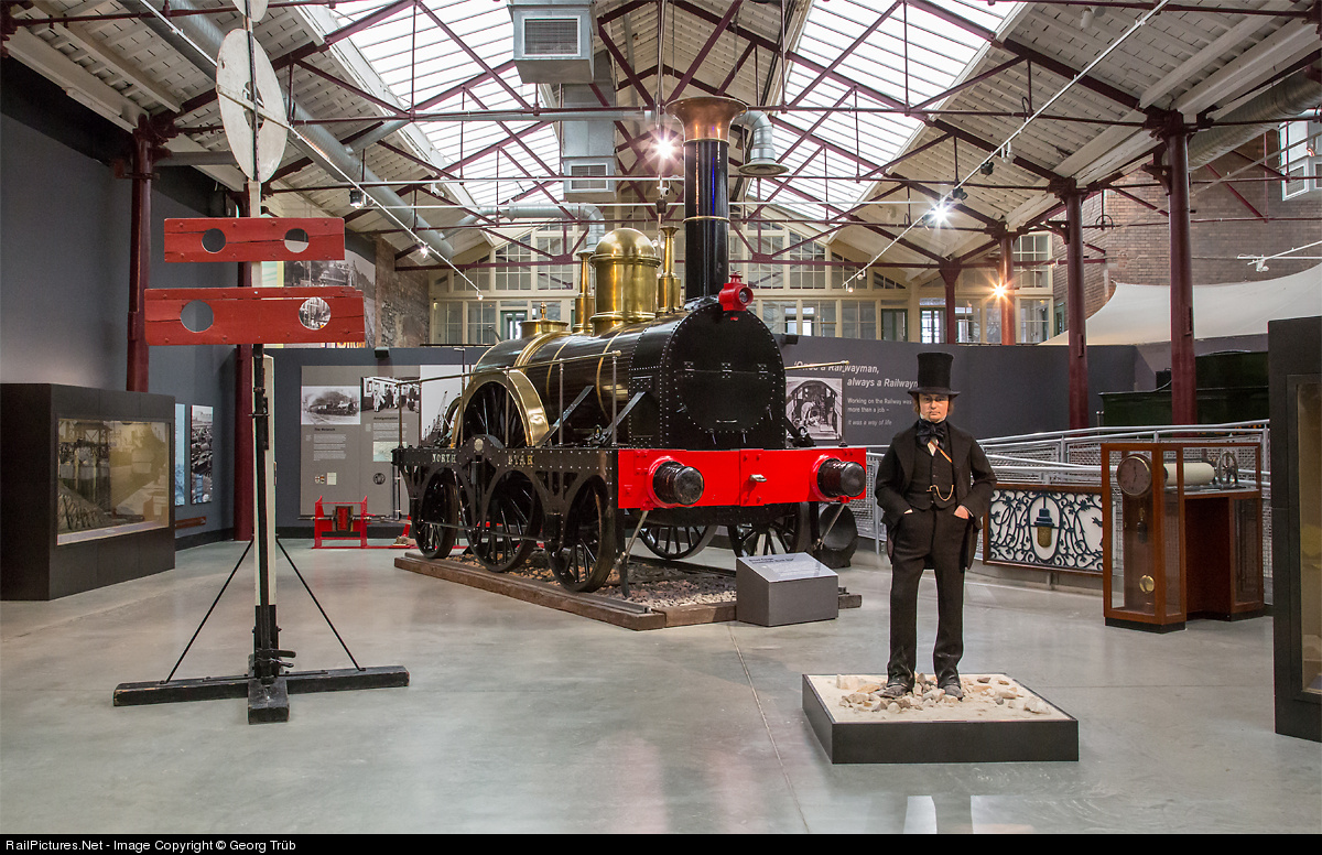 Broad gauge (7 ft 1/4 in/ 2140 mm) steamlocomotive "North Star" of the Great Western Railway (GWR) Star class, built in 1837 by Robert Stephenson. This non working replica was built in 1923 with some parts of the original locomotive and is exhibited in the "Steam" museum in Swindon. In front of the locomotive, Isambard Kingdom Brunel, genius English mechanical and civil engineer, builder of the Great Western Railway. This railway was built in broad gauge, but converted to standard gauge between 1854 and 1892.