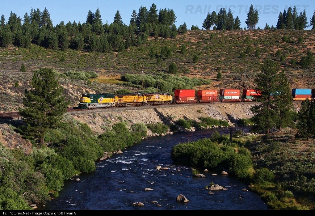 | C&NW invades Donner! UP 1995 (CNW heritage) brings its colorful green and yellow livery to the beautiful Truckee river canyon east of Truckee, CA. UP 1995 is joined by a pair of GE motors on the point of the IG3OA-11 which is near the old SP station of Polaris. Many railfans know this area as Glenshire, which gets its name from the road overpass from which this photo was captured. |