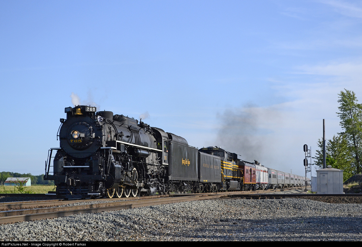 Running very late (6:41 P.M.), the third Norfolk Southern Employee Special with NKP 765 and NKP (NS Heritage Locomotive) 8100 heads north over Attica Junction - the site of many well-known B&O and PRR steam photographs. Had it been on time this shot would have been impossible.