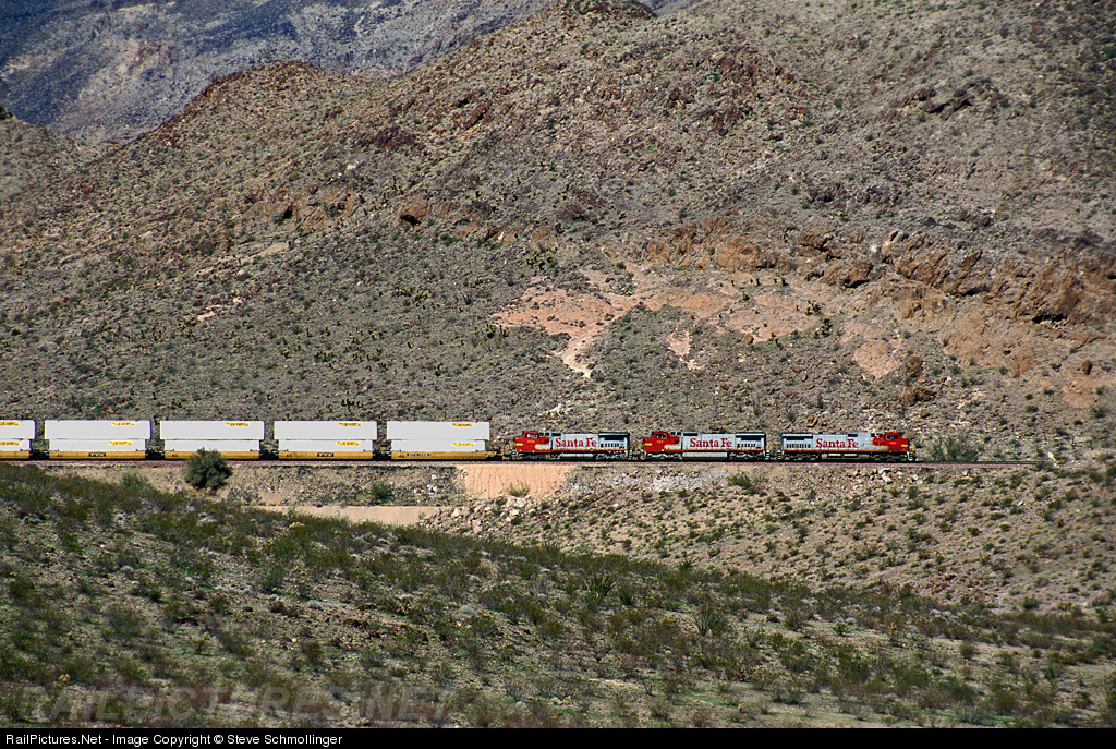 An eastbound Santa Fe stack train skirts a mountain of decomposing rock between Franconia and Yucca, AZ.