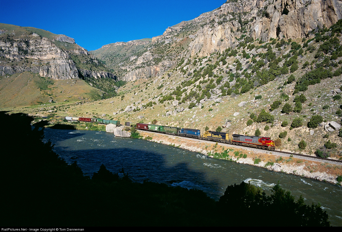 | A BNSF westbound manifest with a Warbonnet Dash 9, and two SD40-2s, rolls through spectacular Wind River Canyon, in July 1999. |
